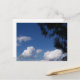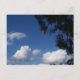 Wish you were here. Blue sky and puffy white clouds framed by a tree on a post card
