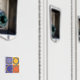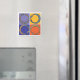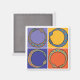 Four blue snakes bite their tales on these squares of blue, red and orange.