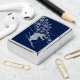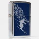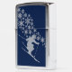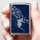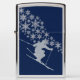 Any snow skier who enjoys the spectacular winter slopes will love this lighter! It features a silver downhill skier in front of a spray of silver snowflakes. Your name or other text is in silver gray at the top right. The image and text are placed on a deep blue background.
