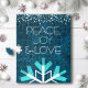 “Peace, joy & love.” A giant, fun, playful, white and turquoise snowflake illustration and modern typography on a rich, deep teal blue marble watercolor background help you usher in the holiday season. A white and turquoise confetti dot border frames the top. Feel the warmth and joy of the holiday season whenever you use this stunning, colorful Hanukkah jigsaw puzzle. Matching cards, envelopes, stickers, tote bags, wrapping paper, serving trays, home décor, and more are also available. Makes a great keepsake present! Comes in a special gift box.