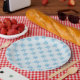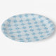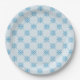 Paper plates featuring blue snowflakes in a square diagonal pattern against a light blue background. Perfect for a fun wintry / Christmas holiday party.
