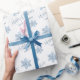 Christmas gift wrapping paper feature snow flakes, modern calligraphy merry Christmas script and personalized text in winter blue and white.