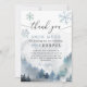 Elegant winter birthday party thank you card featuring watercolor illustration of blue snowy mountain with pine trees and snowflakes. The text says "thank you snow much for making my 1st birthday ONEderful." Perfect for a boy's first birthday.