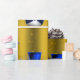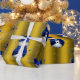 A cute and colorful gold Christmas wrapping paper featuring a pattern of little snowmen dressed in blue velvet top hats and vests, surrounded by gold stars to give your gift wrapping this holiday season a whimsical and stylish touch.