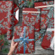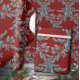 An elegant, sophisticated and festive holiday wrapping paper featuring blue spruce branches and red berries in lattice formation on a dark red background.