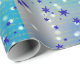 Christmas wrapping paper covered in blue stars, white snowflakes and the scriptural announcement of the birth of Christ in golden lettering. All on a multi toned blue background.
