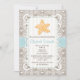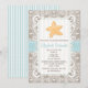 Pretty beach and nautical themed bridal shower invitations with a yellow starfish, delicate swirl framed border and printed aqua blue contrast stitch look design on a subtle striped background with a damask and heart pattern. The back of this wedding shower invitation has a blue and white stripes seersucker print. Artwork © Chrissy H. Studios, LLC. All Rights Reserved.