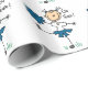 Wrapping paper with a cute stick figure cheerleader in a white and blue uniform with blue pom poms.