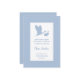 Simple but attractive blue and white birth announcement with a silhouette of a flying stork.