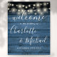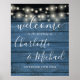 Featuring pretty string lights and signature style names, this elegant rustic welcome sign can be personalized with your information in chic lettering on a blue wood panels background. Designed by Thisisnotme©