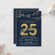 Elegant 25 Year Class Reunion invitation featuring strings of lights and "25" in faux gold foil with "year reunion" in white against a dark blue background on the front and a dark blue and faux gold polka dot pattern back side. Check out other matching items here https://www.zazzle.com/collections/school_reunion-119258151199573326?rf=238364477188679314