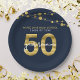 Throw a 50 Year Class Reunion and impress guests with matching paper plates. This stylish plate features strings of lights and "50" in faux gold with "year reunion" in white against a dark blue background. Check out matching invitations and items like stickers here https://www.zazzle.com/collections/school_reunion-119258151199573326?rf=238364477188679314