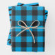 3 sheets of blue patterned wrapping paper sheets. A blue buffalo plaid wrapping paper sheet, blue houndstooth wrapping paper sheet and a striped blue wrapping paper sheet.