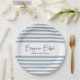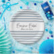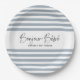 Designed to match the color of our nursery collection. The design features simple yet modern blue and white stripes, a header that reads "Bonjour Bebe", meaning hello baby, and one line of text for personalization.