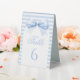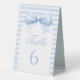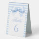 Elegant classic preppy baby boy shower table numbers on table tent sign showcasing cute baby blue bow on bohemian arch and striped pattern at the back. Perfect for sweet baby boy celebration in coquette theme.