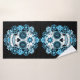 Dia de los Muertos sugar skull in colorful hues of blue surrounded by flowers.
