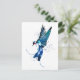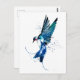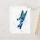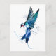 a traditional watercolor animal artwork featuring a swallow bird flying around in surreal blue and turquoise colors on a postcard.