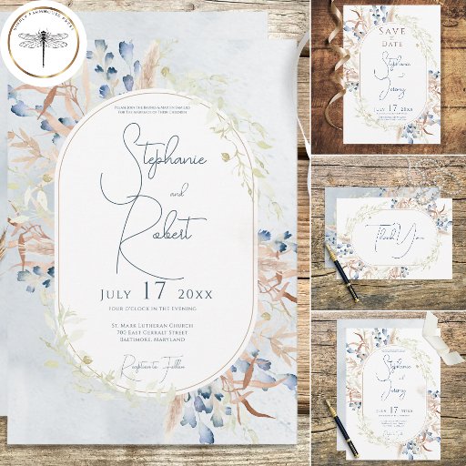 Blue & Tan Dried Boho Flowers Blue QR Code All In One Invitation