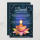 Illuminate your Diwali with the radiant glow of our exquisite celebration! Our invitation features a hand-drawn illustration of a stunning ornate Diwali lamp, bathed in in blue and teal hues with golden, yellow, and orange accents. The candlelight dances against a blue ombre background, adorned with glimmer and bokeh, creating an enchanting atmosphere. The elegant script font typography adds a touch of sophistication to this invitation, promising an evening of joy, light, and shared blessings.