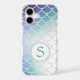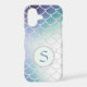 This gorgeous phone case features your monogram in blue on a pale teal circle banner lined in a glittery frame. The banner is placed on a pretty gradient background that is covered with glittery fish scales. Unique with color that almost glows! *Please note - the image is printed and contains no actual glitter.