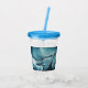 This acrylic tumbler with it 's own lid and straw has an image of what looks like marble or stone in hues of deep teal blues and gold that wraps completely around over the clear tumbler. Golden-tan thin accent stripes wrap around front to back at top and bottom of the image. Lid and straw shown in blue. Choose your color lid /straw set.