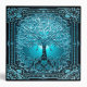 A beautiful ornate design with a blue tree of life with an ornate frame and a heart at the roots. There is a night sky background.