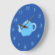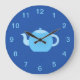 A picture of a light blue and brighter blue teapot on a navy color background. A nice simple design, with a tea drinking theme.