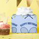 This sports themed design has a pattern of crossed tennis rackets, tennis balls and text which can be customized. The background is light blue and the text dark blue. The default greeting is "HAPPY BIRTHDAY" but this can be changed, for example add a name or your own preferred caption.