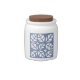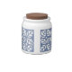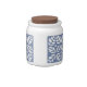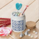 Cute blue candy dish or treat canister. White ceramic with cork lid. Use it in the kitchen or bath. Hide your pet treats or your secret chocolate stach. The pattern comes from a tile design by Oregon Tile maker Fay Jones Day.