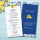 Add a touch of Mediterranean elegance to your special day with this personalized Italian Wedding Menu Card, featuring a classic blue and white Italian tile border accented by vibrant yellow lemons for a fresh, timeless look. The menu details are displayed in a chic navy blue font against a crisp white background, creating a sophisticated yet inviting design that perfectly complements your Mediterranean wedding theme. On the back, a joyful "That's Amore" adds a charming touch, along with a heartfelt thank you message from the happy couple, making this menu not only a stylish addition to your wedding table but also a cherished keepsake for your guests.