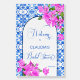 Blue Tiles and Bougainvillea elegant Mediterranean Greek Santorini Mykonos themed bridal shower welcome sign board.