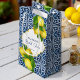 Blue tiles and lemon Amalfi Positano Mediterranean style bridal shower custom gift bag, Morocco style carved border.