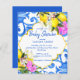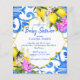 Blue tiles Bougainvillea and lemon Amalfi Positano Mediterranean style baby shower budget invitation template Morocco style carved border, gender neutral.