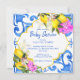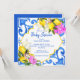 Blue tiles Bougainvillea and lemon Amalfi Positano Mediterranean style baby shower invitation template Morocco style carved border, gender neutral.