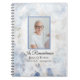 Funeral Guest Book. This classy custom flowery memorial tribute notebook features a digitally watercolor painted floral photograph of white carnation flower blossom petals with a pale light blue tint. Personalize it with birth and death date, name and picture of the deceased.