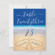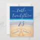 Dark Blue Beach Wedding Table Number Card. Two hearts in the sand, dark blue background