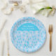 Blue custom baby shower paper plate, with graphics of a white and turquoise blue raindrop pattern and a big turquoise blue umbrella. Personalize the white text to read what you want. Matching invitations and other party supplies are available.