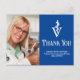 Custom blue veterinary school graduation thank you postcards with the veterinarian medical caduceus next to your graduate photo. Customize these postcards of thanks with chic white script next to your photograph for your animal clinic.