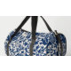 A stylish duffel bag featuring a bold floral pattern in navy blue against a light background.