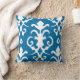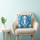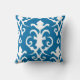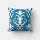 Throw pillow with a damask pattern. Handmade in the USA. Large cotton pillow with a vintage damask design in white on a blue background.