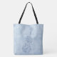Graceful blue violins, drawn with elegant flourishes and calligraphic embellishments, appear three times on one side and once on the other of this stylish tote bag (with crossover strap option). The lighter blue background has been given a textured effect, causing it to resemble leather and setting off the stringed instruments to nice advantage.