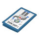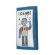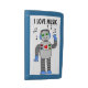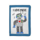 This is a blue wallet with an image of a robot who loves music.