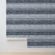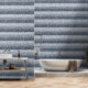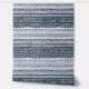 Blue and white wallpaper with a geometrical pattern made of drawn stripes and shapes.