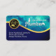 A gold wave demarcates an upper blue water layer against its darker blue counterpart. Riding on this gold wave of success is a gold "plumbing and heating" logo you can use. Your prestigious name is at the top of a special "Plumber" motif. At the lower left corner lies the phone contact details.