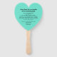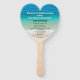 Heart shaped, beach wedding fan program with blue water background and text on both sides. Include names on the front, "order of ceremony" and list the order beneath. The back is turquoise with black text to list the wedding party members and to thank others who made the day special. Text is black except for the title which is off-white printed over blue ocean.
