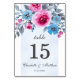 Romantic and modern table number design featuring a floral watercolor design on a light blue background.