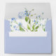 A pretty wedding envelope in cornflower blue with light blue watercolor flowers and greenery inside.