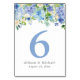 Summer Watercolor design Table Numbers featuring Pastel blue and lavender, Hydrangea, white roses, floral designs and dusty blue colored text on an white background.