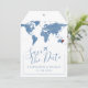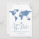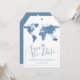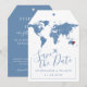 A luggage tag shaped destination wedding save the date with an elegant dusty blue watercolor world map and editable heart destination marker and romantic heart airplane icon. Select your own background color on the back side of the tag card to coordinate with your travel theme wedding colors.