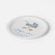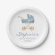 Invite guests to your event with these customizable baby shower paper plates. It features a watercolor illustration of a baby stroller with floral accents. Personalize by adding your details. These blue baby shower paper plates are perfect for It's a Boy baby shower.